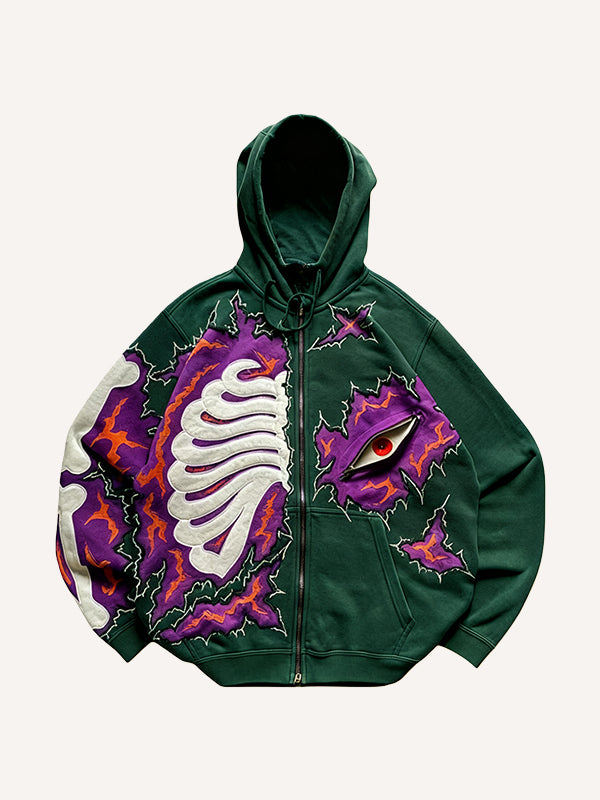 This men’s graphic zip-up hoodie is a bold streetwear hooded jacket designed for standout urban style and everyday comfort. Featuring a striking skeleton ribcage graphic print with vibrant contrast artwork, this hoodie delivers a unique, edgy look inspired by modern street fashion.